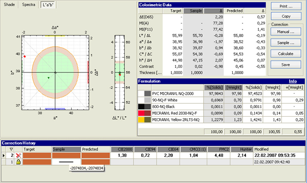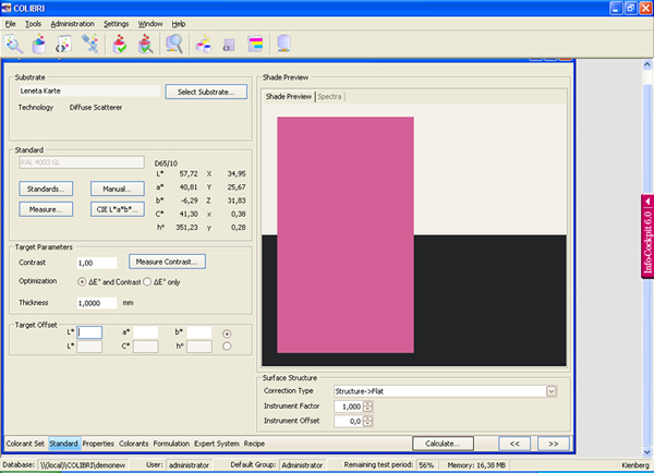除了能精準(zhǔn)快速地給出顏色的計(jì)算配方,軟件同樣能使顏料的添加量達(dá)到MAX化。所有影響配方計(jì)算的關(guān)鍵因素,如目標(biāo)顏色遮蓋率、涂膜厚度或塑膠片厚度,都可顯示在配色流程的主界面上,讓您一目了然。