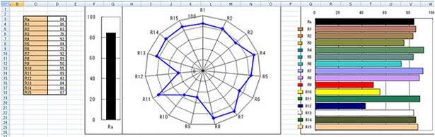 顯色指數(shù)采用直觀顯示,便于理解。被測光源和標準光源的色差一目了然,條形圖顯示一般顯色指數(shù)Ra(特殊顯色指數(shù)R1至R8的平均值)和15種特殊顯色指數(shù)(R1至R15)。