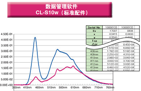 CL-500A不但可以測量顯色指數(shù),還可測量照度(lx)、色坐標(1931xy, 1976u'v')、相關(guān)色溫T?uv、三刺激值XYZ、特征波長λ、色純度Pe、色差值。通過隨機附送的軟件CL-S10w,可連接電腦顯示光源的顯色指數(shù)評估圖、色溫色坐標圖、光譜數(shù)據(jù)等。針對同一批次LED也會出現(xiàn)較大色差的問題,軟件提供按顏色對LED分級的功能。