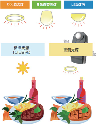 除了熒光燈,LED(發(fā)光二極管)也已被用作照明燈。物體在這些光源下顯示的色貌與其在自然光下原色貌進行比較,兩者的接近程度就是光源的"顯色性"。