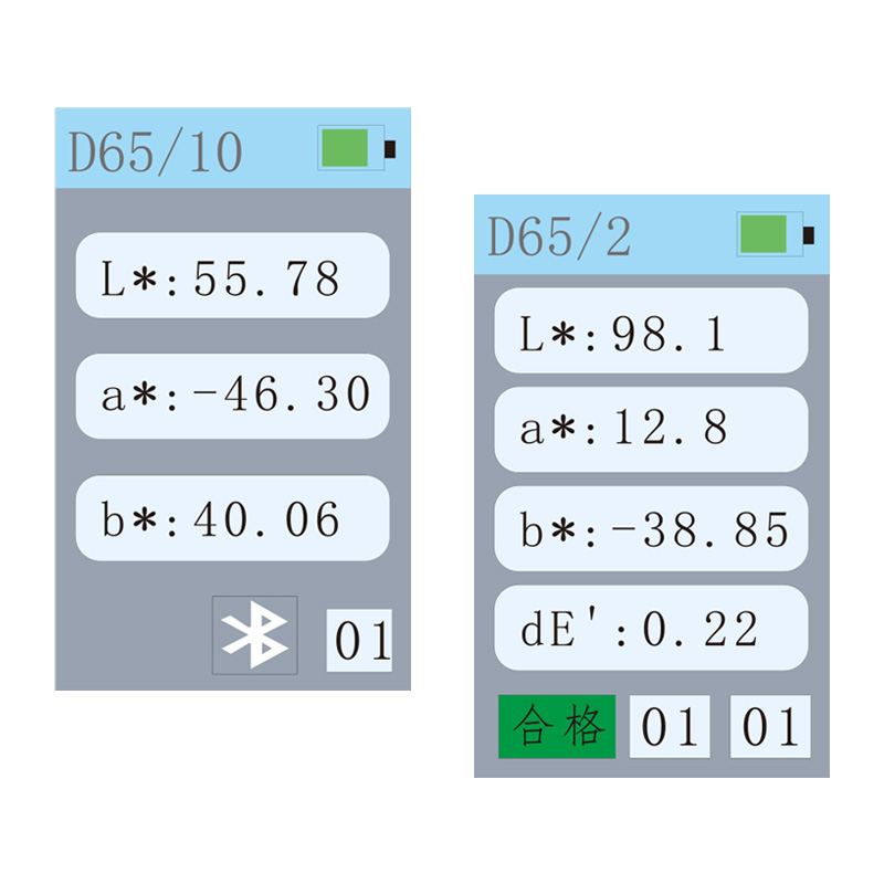 顯示 | 樣品色度值,色差值/圖,合格/不合格結(jié)果,顏色仿真,顏色偏向,反射率(部分通過手機(jī)APP實(shí)現(xiàn)) | ||